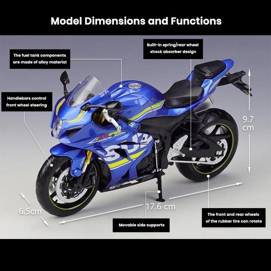 This Suzuki GSX-R1000 die-cast model blends authentic superbike aesthetics with functional miniature features, making it a standout piece in any motorcycle model collection. 🏍️🔥