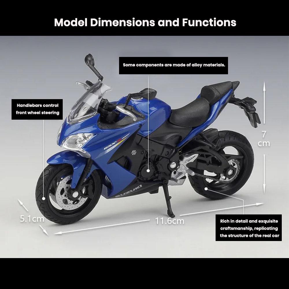 Experience the power and precision of the Suzuki GSX-S1000F in miniature form with this 1:18 scale die-cast model. Designed with meticulous attention to detail, it perfectly replicates the real motorcycle’s structure, making it a standout piece for collectors and motorcycle enthusiasts.